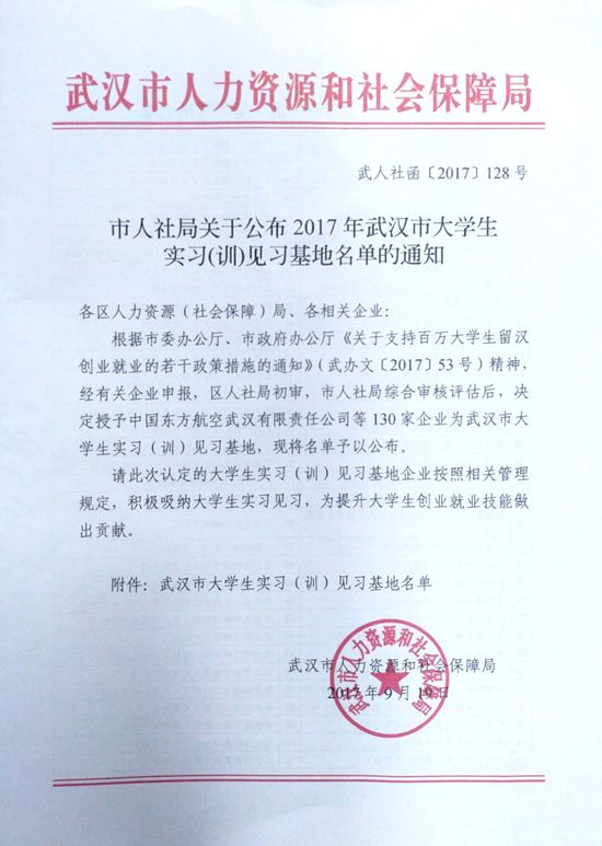 為大力實(shí)施“百萬大學(xué)生留漢創(chuàng)業(yè)就業(yè)計(jì)劃”,貫徹落實(shí)武漢市委辦公廳、市政府辦公廳《關(guān)于支持百萬大學(xué)生留漢創(chuàng)業(yè)就業(yè)的若干政策措施》文件精神,武漢市人力資源和社會(huì)保障局組織專班通過實(shí)地走訪的形式對(duì)企業(yè)進(jìn)行考察和評(píng)估,經(jīng)多輪遴選,我司被確認(rèn)為2017年武漢市大學(xué)生實(shí)習(xí)(訓(xùn))見習(xí)基地。